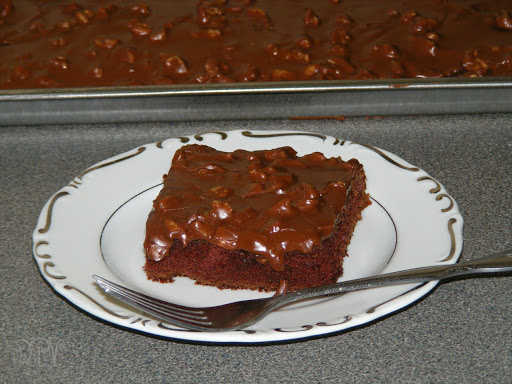 Melt butter in a small saucepan. Whisk in the cocoa. Add to the confectioners sugar mixture and beat with a mixer until smooth. Stir in the pecans. Pour over warm cake, spreading evenly.