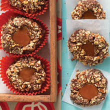 Thumbprints are a favorite for many when it comes to holiday cookie assortments. For this variation on a classic, we've chosen the decadent flavor combination of chocolate and caramel, dressing it up with chopped nuts for a rich, buttery, gooey treat.