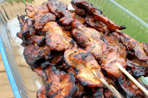 Once you are ready, sew them onto the skewers, about three slices per skewer. Heat your grill, and cook the pork. You know when the sugars start to melt into the meat, become one, and look heavenly.