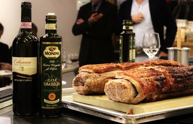 5. Lay the loin on top of the belly and wrap loin with the belly, skin side out, like a jelly roll. Tie with butcher’s twine. Set pork skin-side up on a rack in a roasting pan and roast for 2 hours, or until the pork has reached an internal temperature of 138 degrees.