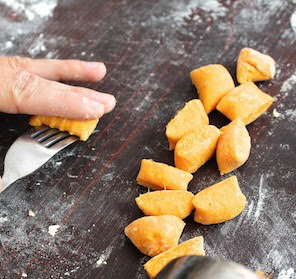 Turn a fork over and hold at a 45-degree angle, with the tips of tines touching work surface. Working with 1 at a time, roll gnocchi down the fork tines, pressing with your thumb, to make ridges on 1 side. Transfer gnocchi as formed to floured baking sheets.