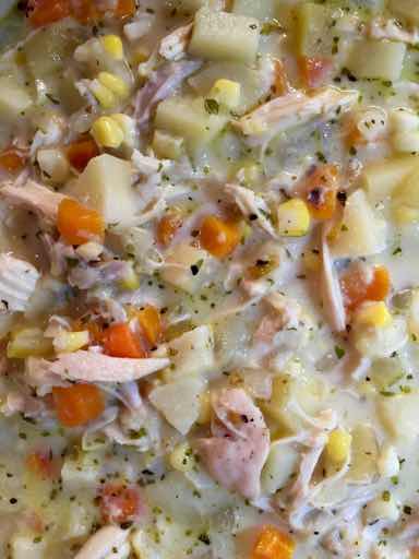 Okay, the Kozy/Smith version is much more of a dump. I use a large onion, one can of creamed corn and at least one can of whole kernel corn, drained. I use way more potatoes, because I love them, and that means that I usually use more than one can of cream of mushroom soup – then enough milk to make it the right consistency. Once the potatoes are cooked, I dump the bacon and butter right in to increase that butterfat and make it yummy.