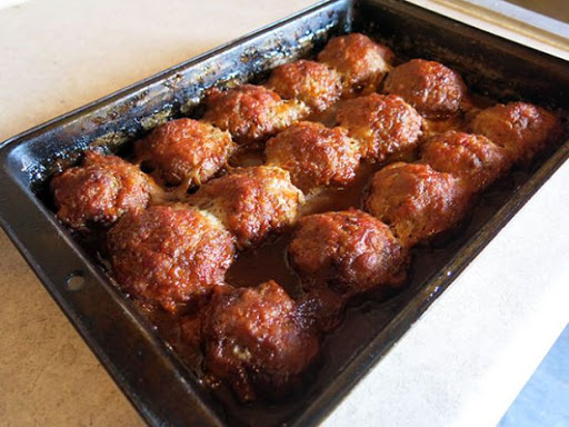 In a large bowl, combine first five ingredients. Using a 1/3 cup measure, shape mixture into 2-in. balls. Place in two large shallow roasting pans. Combine all remaining ingredients; pour over balls. Bake at 325° for 1 hour, basting frequently with sauce. Yield: about 15 servings.