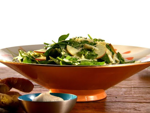 Toss the spinach, apple, and celeriac in a large serving bowl and season with salt and pepper, to taste. Pour 1/2 of the dressing over the salad and toss again. If you prefer more dressing, add it all, which I recommend. Let it sit for 5 minutes, then garnish with pistachios and serve.
