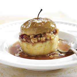 Choosing the right apples—Granny Smiths—was the first step to developing a baked apple recipe with good texture and flavor. Peeling the apples kept them from getting mushy in the oven, while sautéing their top edges before stuffing them with a dried fruit and nut filling gave the apples themselves an intense flavor. As the final step, we used the slices we had lopped off the tops of the apples as a natural covering during baking, so the filling wouldn’t burn.