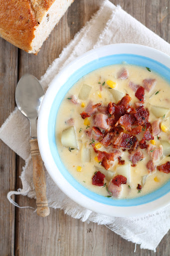 Melt butter in a large stockpot or Dutch oven over medium heat. Add the onion and garlic and cook, stirring frequently, until tender, about 2-3 minutes. Add the corn and the flour and cook, stirring frequently, about 1 minute. Pour in the milk and cook, stirring constantly, until slightly thickened, about 3-5 minutes. (It won't be super thick yet at this point) Stir in the potatoes and thyme. Bring to a boil and reduce heat to a simmer. Continue to cook about 15-18 minutes until the potatoes are tender. Stir in the ham and cheese and season with salt and pepper to taste. Serve immediately and garnish with bacon.