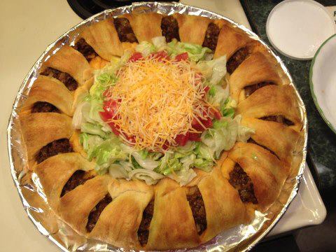 Add cheese, lettuce, tomato, black olives, sour cream or whatever you desire for your tacos, in the middle.