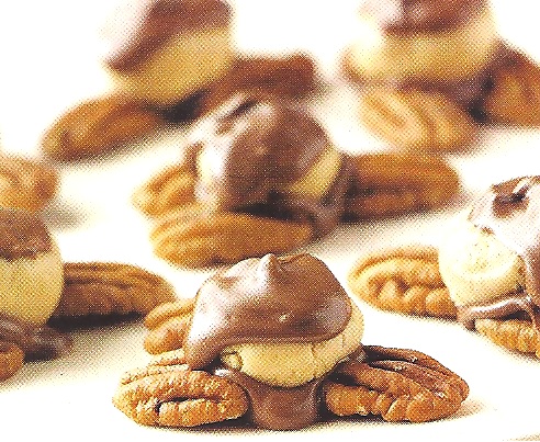 3. Spoon ¼ teaspoon melted chocolate into the center of each pecan cluster. Place teaspoonfuls of peanut butter mixture into the center of each cluster; press down slightly. Spoon remaining melted chocolate over tops. Chill for 10 minutes or until set. Store in an airtight container in the refrigerator.