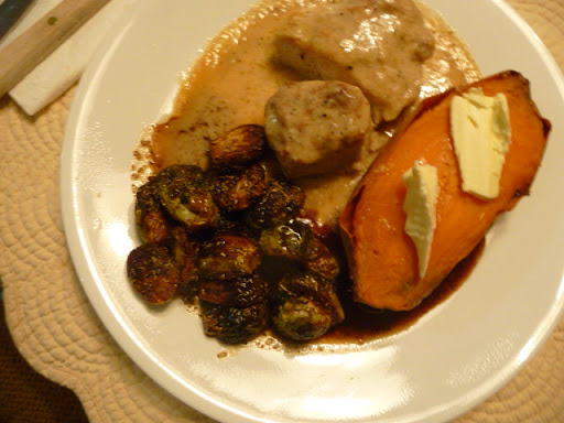 Put olive oil in a sauce pan and place the Brussels sprouts cut half down over medium heat. Cook about 4-5 minutes browning the cut half.