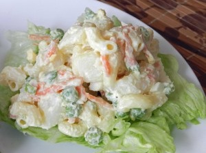 In a large bowl, place chopped potatoes. Add the cooked macaroni. Add the diced eggs. Add the shredded carrots. Add the peas. Add the green onions. Add the dressing and stir to combine.