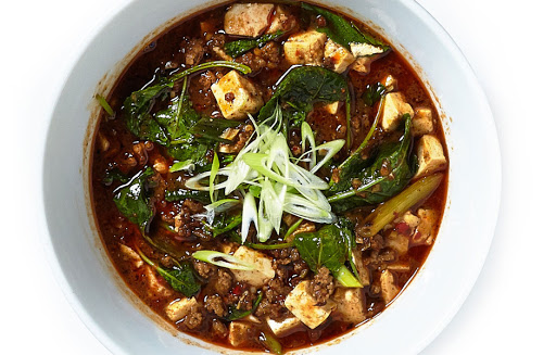 Serve mapo dofou over rice topped with thinly sliced scallions.