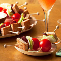 Cut each bacon slice into 6 pieces. In large skillet, cook over medium heat until medium-crisp, about 8 minutes. Cut each toast slice into 8 squares. Using food processor, puree mayo, basil and 2 tbsp. water; season. Thread 1 piece each bread, bacon, lettuce and tomato on skewer or toothpick; repeat with remaining ingredients. Serve with sauce.