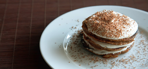 To serve, dollop a generous amount of the cream in between layers of pancakes. Top with more cream, and then top with shaved chocolate, or a light dusting of sifted cocoa powder.