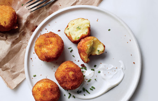 Mix egg yolks, mashed potatoes, Parmesan, chives, and flour in a medium bowl. Roll into walnut-size balls; chill until cold, at least 2 hours.