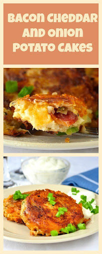 The mashed potatoes get blended with some red onion, garlic and green onions as well as some crisp-cooked bacon and diced cheddar which melts to gooey pockets right inside the potato cake. They are then fried to a golden crispy exterior while retaining a creamy, delicious inside. An alternative to frying is to roll them in panko crumbs, and place on a lightly oiled parchment lined baking sheet in a 400 degree F for about 20-25 minutes turning at least once during the baking time.