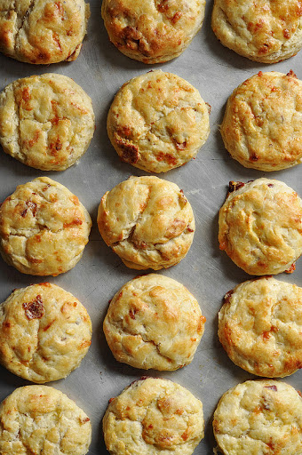 For the Sauce: Combine the sour cream, grated garlic, sliced green onions and a bit of salt and pepper, in a bowl. Whisk until smooth. Serve with the scones. Will keep in the fridge, covered, for a couple of days.