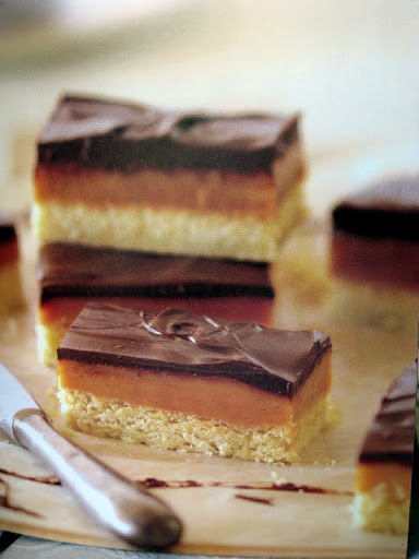 Melt the chocolate and pour it over the topping and let stand for 30 minutes until set. Cut into squares.