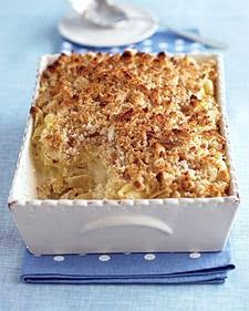 Place bread in food processor; pulse until very coarse crumbs form (you should have about 3 cups). Add reserved melted butter, and pulse just to moisten. Scatter crumbs over pasta in baking dish. (If making ahead, cover and refrigerate up to 1 day.)