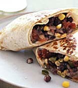 3. Lay the tortillas on a work surface. Sprinkle the cheese in the center and spoon about 1/4 cup bean mixture on top. Fold the tortilla burrito-style.