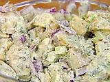When the potatoes are cool enough to handle, cut them in quarters or in half, depending on their size. Place the cut potatoes in a large bowl. While the potatoes are still warm, pour enough dressing over them to moisten. Add the celery and red onion, 2 teaspoons of salt and 1 teaspoon of pepper. Toss well, cover, and refrigerate for a few hours to allow the flavors to blend. Serve cold or at room temperature.