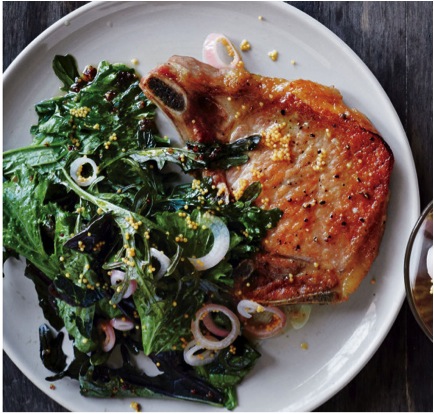 Serve pork chops with greens topped with pickled shallot and mustard seeds and drizzled with more oil.
