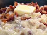 Drain and return to stockpot. Beat with an electric mixer until smooth; adding salt, to taste, pepper, butter, garlic and sour cream. With a spatula stir in cheese and bacon. Add more salt and pepper, if necessary. Serve immediately.