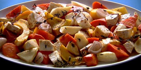 Toss carrot, parsnip, celery root and squash with shallots, olive oil and thyme and season lightly. Place in an 8-cup baking dish and roast for 30 to 40 minute, until vegetables are equally tender. Remove thyme sprigs.