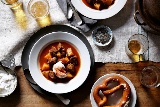 Add caraway seeds, marjoram, garlic and just enough water to cover meat. Increase heat to high and bring to a boil. Decrease heat to medium, cover loosely and simmer gently until meat is almost completely tender, 45-60 minutes. Add diced potatoes and cook slowly until meat and potatoes are completely soft, 20-25 minutes more. Add water as needed to maintain a soupy consistency. Check and adjust seasonings.