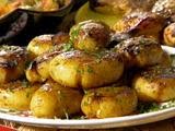 Place the potatoes in a deep skillet and add salt and pepper, to taste. Cover potatoes halfway with chicken stock, about 3 cups, add the butter and cover skillet with a lid. Cook the potatoes in the stock until almost tender, about 5 to 8 minutes, depending upon the size of the potatoes. Remove the lid and allow the stock to evaporate, about another 5 minutes. Once the stock has evaporated pop each potato using a ladle or large spoon, creating a small crack in each, but do not smash. Allow the potatoes to brown on each side, another 5 minutes, and re-season with salt and pepper, if necessary or desired. Remove the browned potatoes from the skillet and place onto a serving platter, garnished with the parsley.