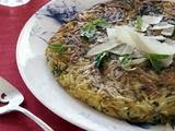 Warm the remaining olive oil over high heat in the same pan that was used to cook the onions. When the pan is hot, but not smoking add the potato mixture. Use a spatula to press the mixture down into the pan firmly and evenly. Turn the heat down to medium and cook the potato mixture until the bottom is golden brown and the pancake can move in the pan, about 12 to 15 minutes. Turn the heat down to medium-low if the pancake is browning too fast in places. Place a large plate on top of the pancake and flip the pancake out of the pan. Turn the heat on the pan back up to high. When the pan is hot slide the pancake back into the pan and cook until the bottom is golden and is cooked through, about 12 to 15 minutes. Slide the pancake onto a serving platter, slice, and serve.