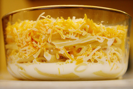 Boil and drain noodles in salted water. Since it’s just the two of us, I boiled 2 cups of penne pasta. That’s enough for 2-3 servings as a side dish. Spray a baking dish with Pam and make layers of noodles, a healthy pinch of salt, and pats of butter.