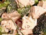 For the dressing, whisk together the mayonnaise, wine, mustards, 1 tablespoon salt and 1/2 teaspoon pepper. Add enough sauce to the warm chicken to moisten well. Add the tarragon, broccoli, and tomatoes and mix gently to combine. Refrigerate for a few hours to allow the flavors to blend. Serve at room temperature.