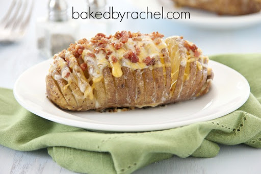 Place a par-cooked Potato horizontal on a cutting board. Using a serrated knife, make slits in each Potato leaving about 1/4-inch spaces in between each cut and leaving about 1/2-inch of the Potato uncut on the bottom (Tip: Rest two wooden spoons on both sides of the Potato to guide your knife and to prevent it from cutting through the bottom). Repeat with remaining Potatoes.