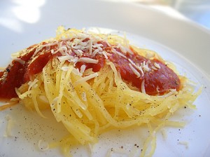 To serve: Shred squash while sauce is cooking. Top with sauce and sprinkle with fresh parsley and parmesan cheese if desired.