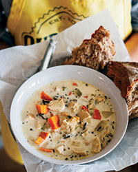 Add the wild rice to the saucepan and gradually stir in the stock and water. Bring to a boil, then simmer over moderately low heat, stirring occasionally, until the vegetables are tender, about 30 minutes. Add the chicken and simmer, stirring occasionally, until the wild rice is tender, 10 to 15 minutes longer. Stir in the cream and season with salt and pepper. Ladle the soup into bowls and serve.