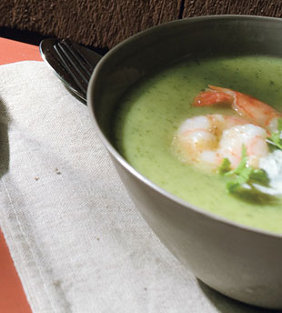 Chilled Zucchini Soup with Lemon-Cumin Shrimp and Cilantro Cream