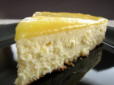 When the cheesecake is cool, top it with the lemon curd while still in the spring form pan. Cover tightly with plastic wrap and refrigerate for at least 5 hours, but 24 hours is better. To serve, remove the sides of the spring form pan and cut into wedges.