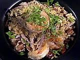 Remove chicken pieces from the jambalaya and cool slightly. Skim the fat. Discard skin and bones and shred chicken meat.