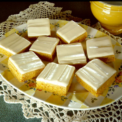Bake for 20 to 25 minutes or until wooden pick inserted in center comes out clean. Cool completely in pan; spread with Maple Icing. Cut into bars.