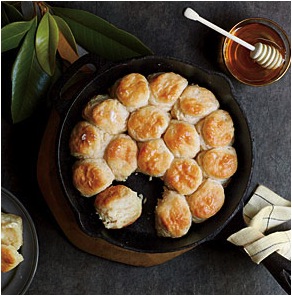 3. Preheat oven to 400°. Turn dough out onto a lightly floured surface, and knead 3 or 4 times. Gently roll dough into a 3/4-inch-thick circle, and fold dough in half; repeat. Gently roll dough to 3/4-inch thickness; cut with a 2-inch round cutter. Reroll remaining scraps, and cut with cutter. Place rounds, with sides touching, in a 10- or 12-inch cast-iron skillet or on a parchment paper-lined baking sheet. Brush biscuits with 2 Tbsp. melted butter.