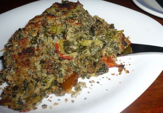 Combine bread crumbs with 2 tablespoons of oil. Toast until brown. Mix half with greens mixtureAdd Romano cheese and place in greased baking dish. Top with remaining crumbs. Bake in oven at 350 degrees for 15 minutes. Garnish with parsley.