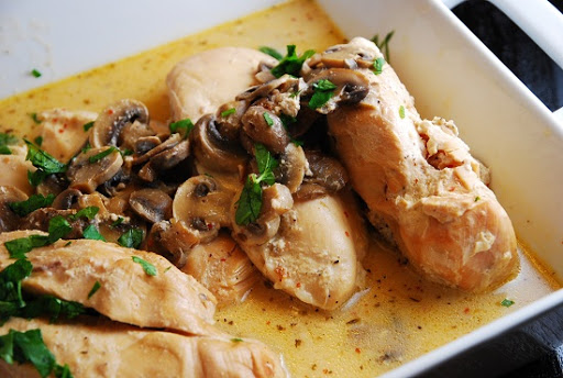 Place mushrooms on bottom of crock pot, then season both sides of chicken with salt, pepper and paprika and place chicken breasts on top of the mushrooms.