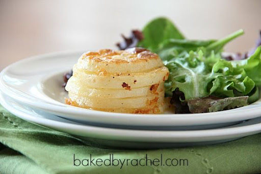Stack potatoes 5-6 slices high per tin. Press down to glue the pieces together and push some of the liquid out around the edges. Sprinkle each stack with 1/8-1/4 tsp more of Parmesan.