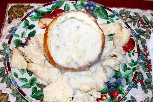 Make a white sauce of milk, flour and half and half, add to potatoes along with the clams and salt and pepper.