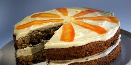 In a saucepan, bring the orange juice and sugar to a boil. Add the sliced carrots. Simmer until tender and translucent, about 8 minutes depending on thickness. Let cool completely. Drain. Twist each carrot slice and arrange on the cake to mark the slices.