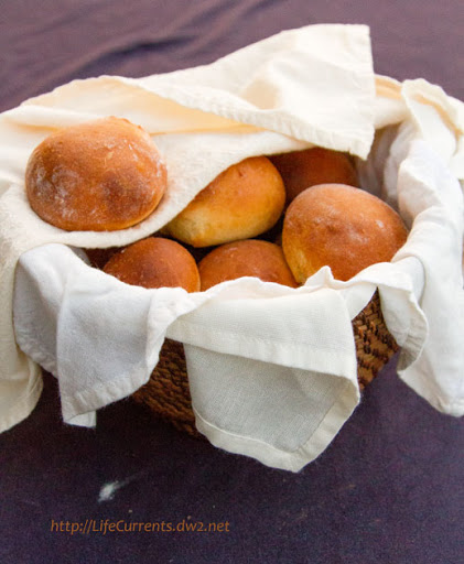 Once dough setting is complete, remove dough from machine and place on a lightly floured surface. Using your hands, divide dough in half, and each half in half again so that you have roughly equal quarters. Divide each quarter into three equal pieces. Roll each piece into a ball and place rolls on two Silpat covered baking sheets (6 rolls per baking sheet), allowing about 2 inches between each roll. Cover rolls with a clean cotton cloth, and preheat the oven to 350° F.