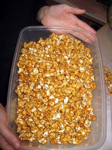 Bake in a preheated oven at 250 degrees for 15 minutes. Take out and stir. Back into the oven for another 15 minutes and stir. You can experiment at this stage. The original recipe calls for a total of 4 cycles (1 hour). For some, this might be too long. I have found out that after one cycle, the caramel is "more chewy" but the flavor is not quite there. The longer you keep the popcorn in the oven, the more brittle it will be and the sugars will take on a more "burnt" caramel flavor. It is up to you! We usually pull ours after 3 cycles (45 minutes). You can add peanuts at an time during this stage.