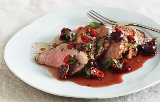 Meanwhile, combine remaining 1/2 cup cilantro, 1/4 cup shallots, 2 tablespoons lime juice, cherries, chile, and olive oil in a medium bowl. Season salsa lightly with salt and pepper and set aside to let flavors to meld