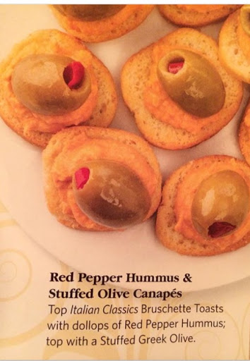 - Italian Classics Bruschette Toasts with dollops of Red Pepper Hummus; top with a Stuffed Greek Olive