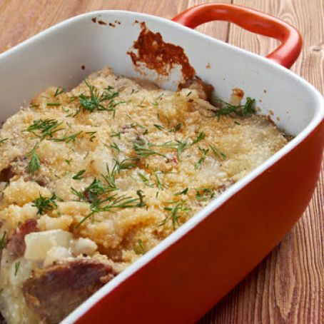 Place a little of sauce on the bottom of baking dish and layer leftover meat on top. Then pour the rest of sauce and onions over the top. Evenly spread breadcrumbs over the top and drizzle with leftover butter.